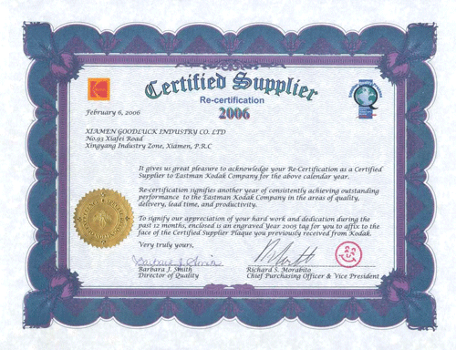 并于西元1989年在中国厦门设立厦门瑞铠工业有限公司,因业务持续扩大,于西元2000年7月份迁址至海沧新阳工业区,工厂佔地面积18,000平方米,且于西元2002年3月份通过ISO9001:2000全面评鑑,至今已有约三十多年的历史,是一家实力极为坚强的公司。 由于业务一直不断的扩大,产能难以满足客户的要求,于是公司于2007年元月建了另外一家公司厦门瑞登纸制艺品有限公司,设立在厦门翔安,工厂佔地面积14,000平方米。两家公司的经营项目及方式相同,经营各种纸製工艺品之一贯作业(从制版作业一直至成品包装出货),销售国家包含亚州、北美州、中东、欧州、澳州等五大州各个主要国家,主要生产项目相当广泛,包含食品礼盒、洋酒礼盒、相框、相本、笔记本、文具组、赠品、礼品等,近年来为服务广大客户,更增加了以布料、皮料、木料、树脂等多种材料研发组合之複合式工艺品,工厂拥有许多台专业的生产製造机器,60多条生产流水线,技术及操作工人800多名,专业的品检人员30多名,更有多位高素养的行政人员为你做各种广大及专业的服务。 本公司以“信誉第一、客户至上”为宗旨,更是本着“用专业的技术、做高级的产品”,不论各种产品的品质更是在各种市场的精品。目前已为IKEA、DISNEY、ENESCO、 EMY MARTIN、WALKMARK等世界各大公司服务多年,希望贵司可以有机会让我们为你服务,让你也拥有世界级的服务品质。 Raykai Enterprise Co., Ltd was established in 1975, which was located in Taipei, Taiwan, and set up Xiamen Goodluck Industry Co.ltd in China in 1989. Because the business expanded continuously, relocated in Haicang Xinyang Industry Region in July of 2000. The factory covers an area of 18000 square meters. In March of 2002 the company passed ISO9001:2000. It is a strong company with over 3 decades of manufacturing experience. Since the capacity can’t keep up with the business expand, we established another company Xiamen Raydeng paper craft&Art Co.ltd in January of 2007,which located in Xiangan Xiamen, the factory covers an area of 14,000 square meters. The two companies produce kinds of paper crafts(from design to product package for shipping). Our market is the main countries of Asia, North America, Middle East, Europe, Australia and so on. We are specializing in food gift box, wine gift box, frame, photo album, notebook, stationery sets, gift box,etc. In recent years, In order to meet more customers’ requirements, we also supply the products which with the components of cloth,leather,wood, resin etc. The factory has a lot of specialized manufacturing machines, over 60 producing lines, The total number of professional staffs and operating workers is more than 800, over 30 professional workers for quality control, meanwhile, many high-quality administrative staffs and salesman supply high quality service for you. With “ reputation is fundamental, customer is first” it is an aim, and with the value of“high-quality products with specialized skills”, we have served for IKEA , DISNEY, ENESCO, REMY MARTIN, WALKMARK etc. for many years. We are looking forward to having the chance to service for you. |